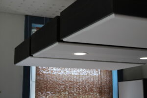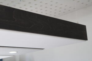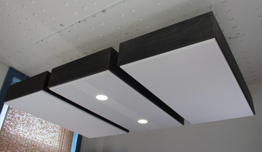 Alle Akustikelemente werden von uns handgefertigt. Alle Verbindungen sind sauber geschlitz und gefalzt und nicht stumpf aneinandergeleimt. So erreichen wir eine hohe Stabilität. Die Deckensegel werden mit Schienen und verstellbaren Abhängern zur Deckenmontage geliefert. Sie können so perfekt auf störende Frequenzen durch Änderung der Höhe abgestimmt werden. Die optionalen Strahler sind so vorbereitet, dass sie einfach an das vorhandende Kabel angeschlossen werden können.